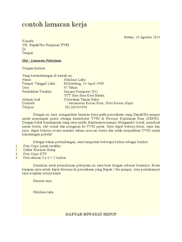 Contoh Lamaran Kerja Di Tvri : Pengertian Surat Lamaran Pekerjaan Halaman All Kompas Com. Terjemahan contoh surat lamaran kerja di hotel di atas: Surat lamaran kerja biasanya dikirimkan untuk melamar sebuah posisi kerja di suatu perusahaan. Berikut adalah contoh surat lamaran kerja di pt, bank, guru, restoran, akuntan, dll. Pt atau perseroan terbatas, ataupun perusahaan sekarang ini menjadi tempat favorit sebagian orang 12. Disertai dengan contoh dalam berbagai bidang keahlian lengkap dengan tips dan trik membuatnya.